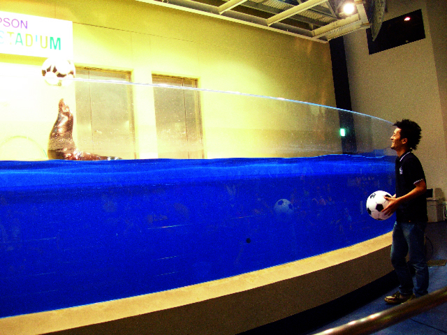 週に5食はカレーという私、ボリュームたっぷりの本格インドカレーをおいしくいただきました。 その後アクアスタジアム行ってきたんだけど、イルカのショーが素敵すぎる。イルカって奴はホント良い奴なんだよ、健気で愛くるしくてさ。 アシカのショーでは400人近くの前でアシカと対決してきた。 ステージ上のかわいいがお姉さんがショーの途中で客席に向かって対戦者を募ったんだけど、誰も立候補しなくて困っていたので手を上げてしまった。 勝負の内容と結果は以下。 ------------------------------------------------------------ 1)ラケット手に乗っけてバランス勝負 → 俺の負け 2)フラフープ勝負 → 俺の負け 3)リフティング勝負 → 俺の負け ------------------------------------------------------------ なかなか強敵だったぜ。
